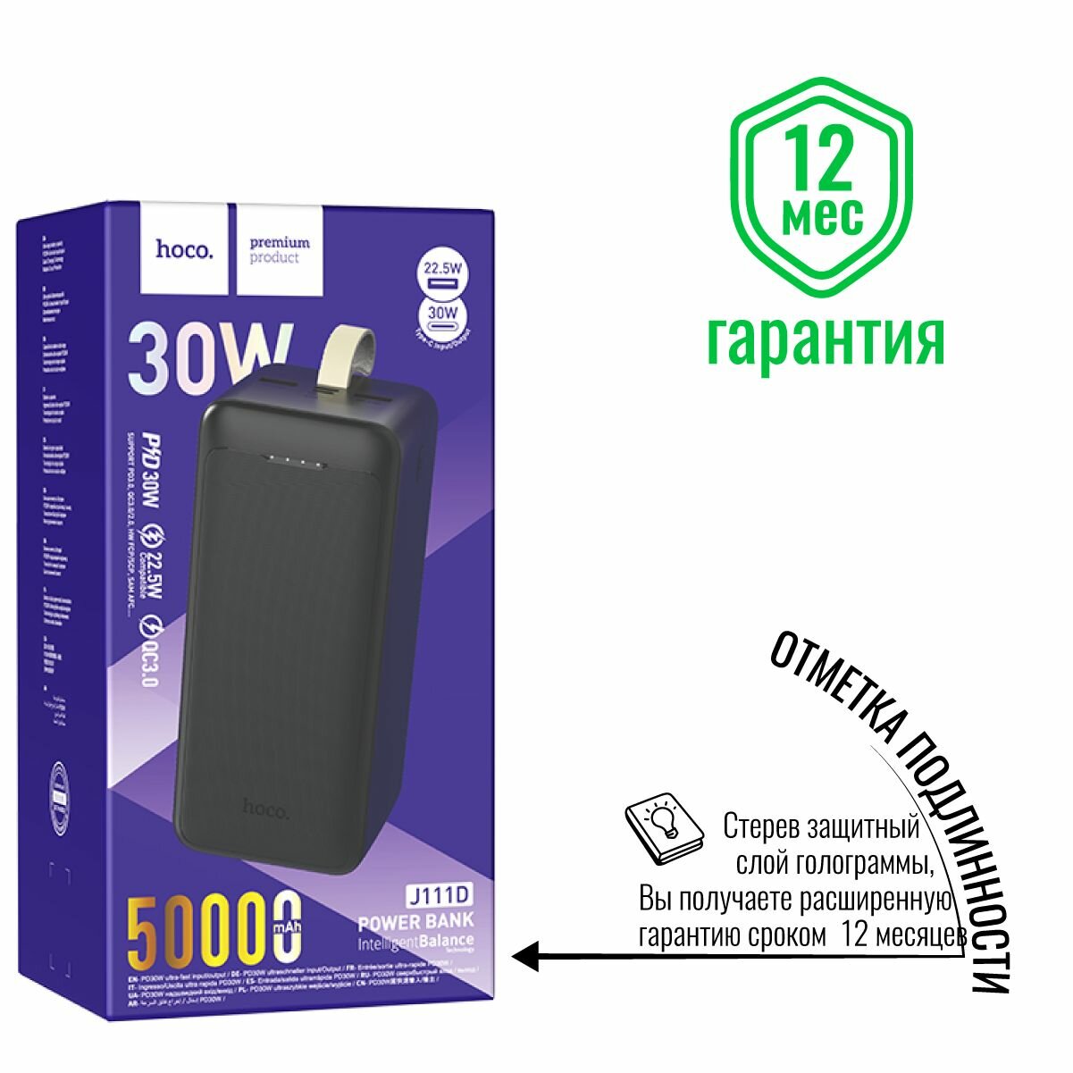 СохранитьУниверсальный Доп. Аккумулятор 50000mAh, J111D, HOCO, выход: 2 USB (22.5W)+1 PD (30W), черный интересное: