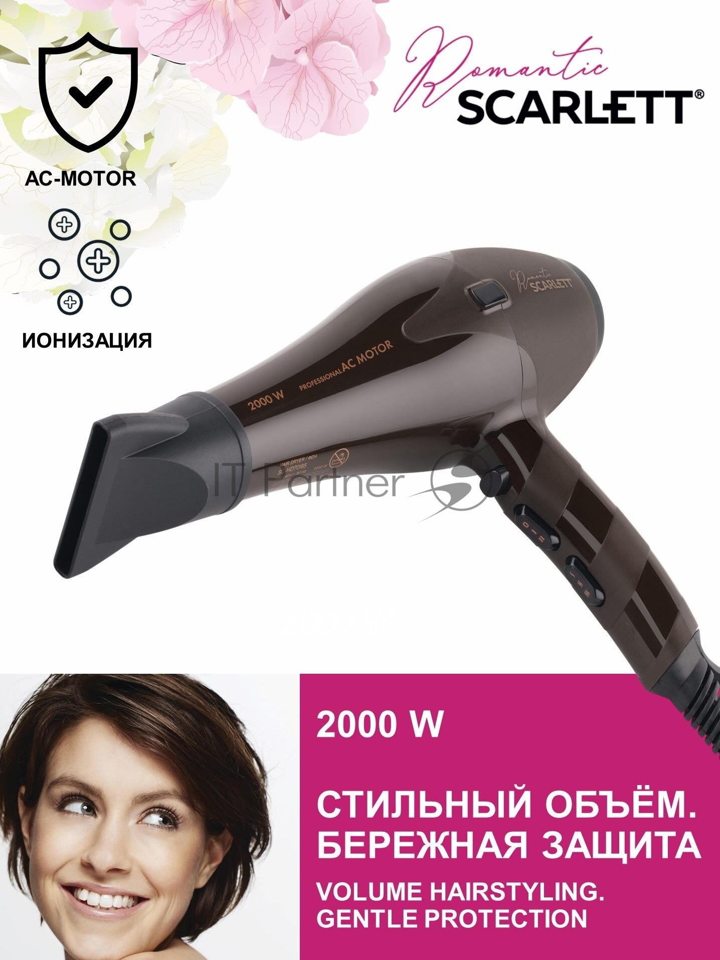 Фен профессиональный Scarlett SC-HD70I85, 2000 Вт, AC мотор, ионизация, 2 скорости, 3 температурных режима, 1 насадка, коллекция Romantic
