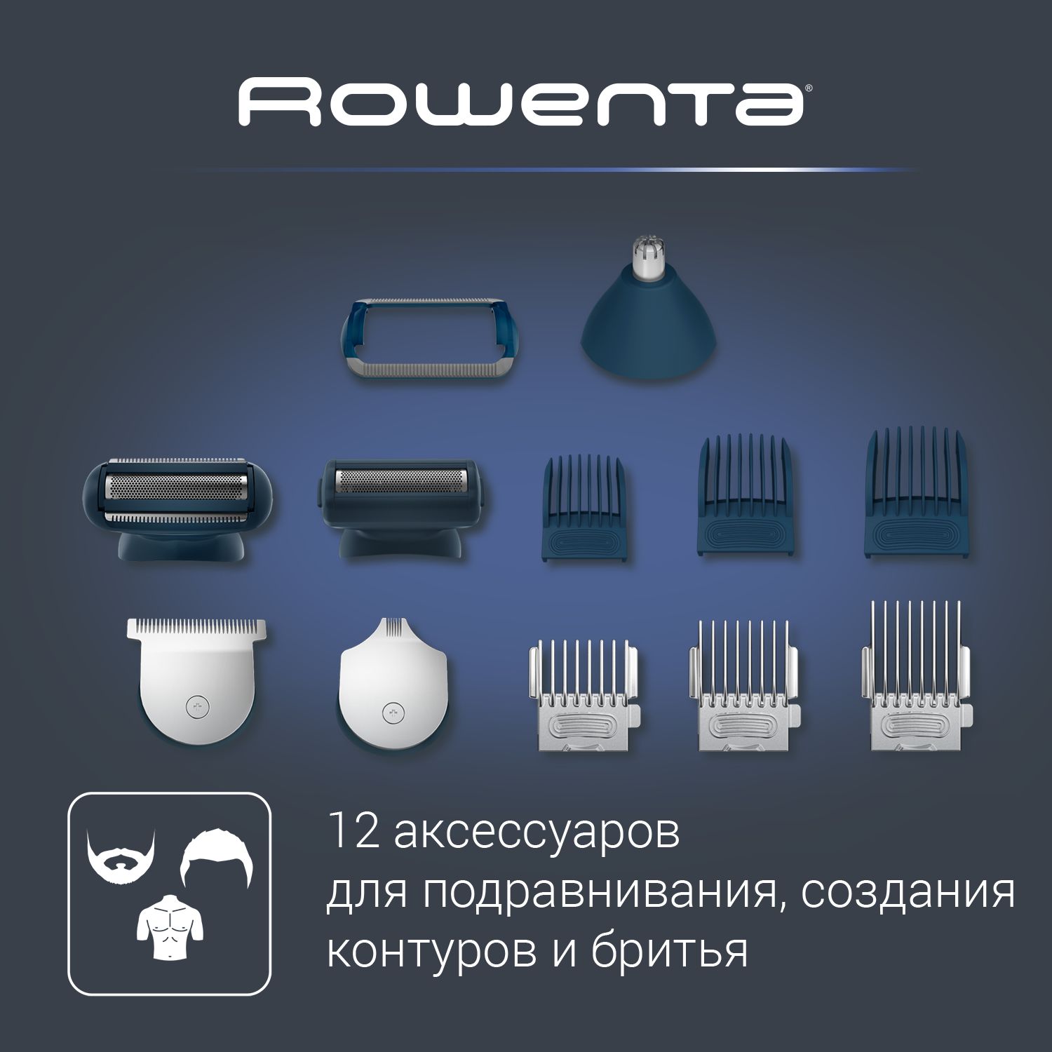 Купить Мужской триммер 14в1 для стрижки бороды и носа Rowenta Selectium TN9460F4 Xpert с 12 насадками и чехлом, синий