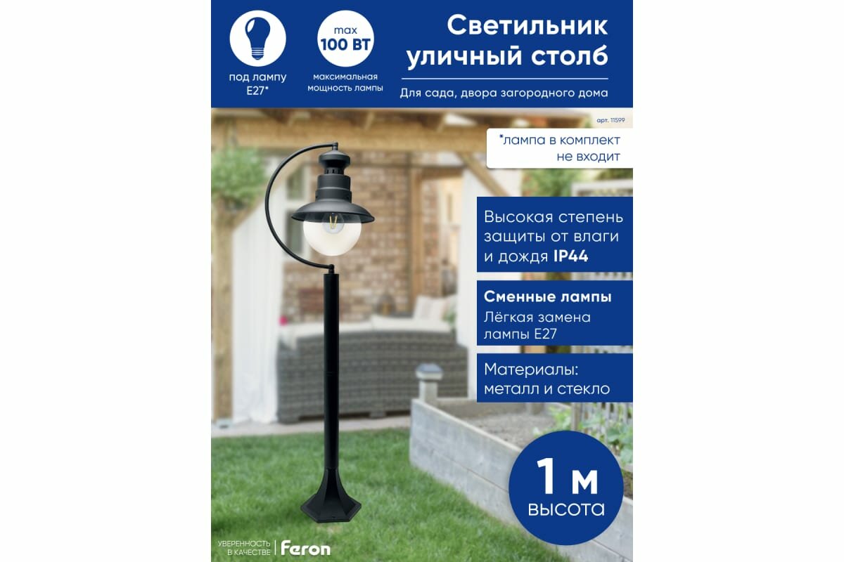Садово парковый светильник Feron 11599, E27, 60 Вт, цвет арматуры: черный,плафон прозрачный