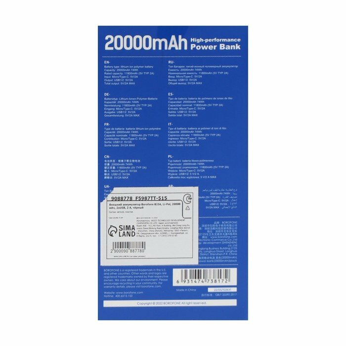 Портативный аккумулятор BOROFONE BJ3A Minimalist, 20000mAh, черный