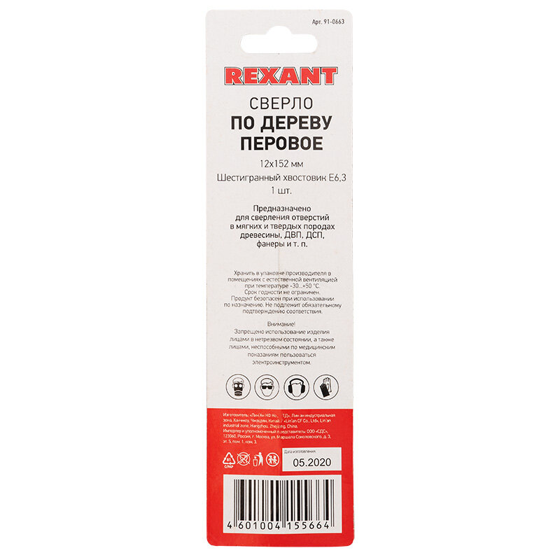 Сверло перовое по дереву 12х152 мм (шестигранный хвостовик) REXANT Артикул 91-0663