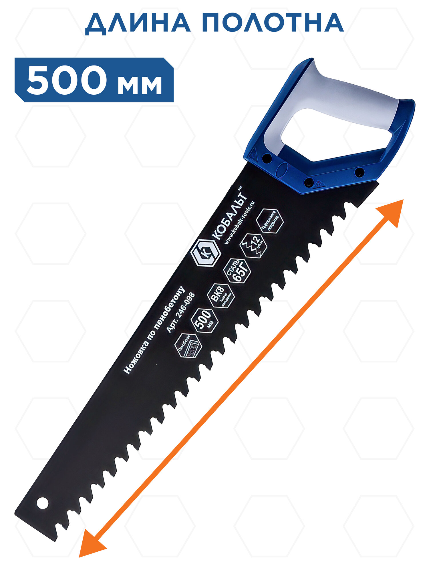 Ножовка кобальт по пенобетону 500 мм, 1 TPI, тефлоновое покрытие твердосплавные напайки на зубья, двухкомпонентная рукоятка 246-098