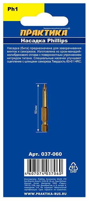 Бита отверточная ПРАКТИКА "Эксперт" PH-1 х 50мм Tin (1шт), блистер (037-060) интересное: