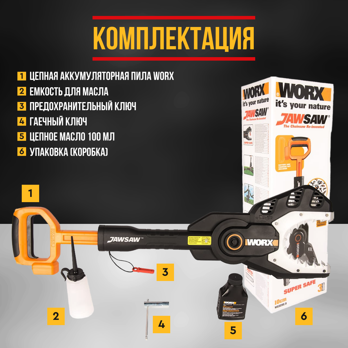 Пила цепная аккумуляторная WORX JawSaw, 20В, без АКБ и ЗУ, мини пила цепная интересное: