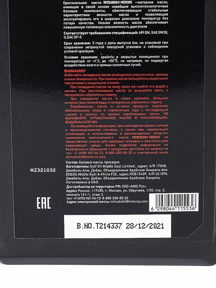 MITSUBISHI 0w30 1l Api Sn/Cf Ilsac Gf-5, ., Mz320753 Масло Моторное Старый Номер