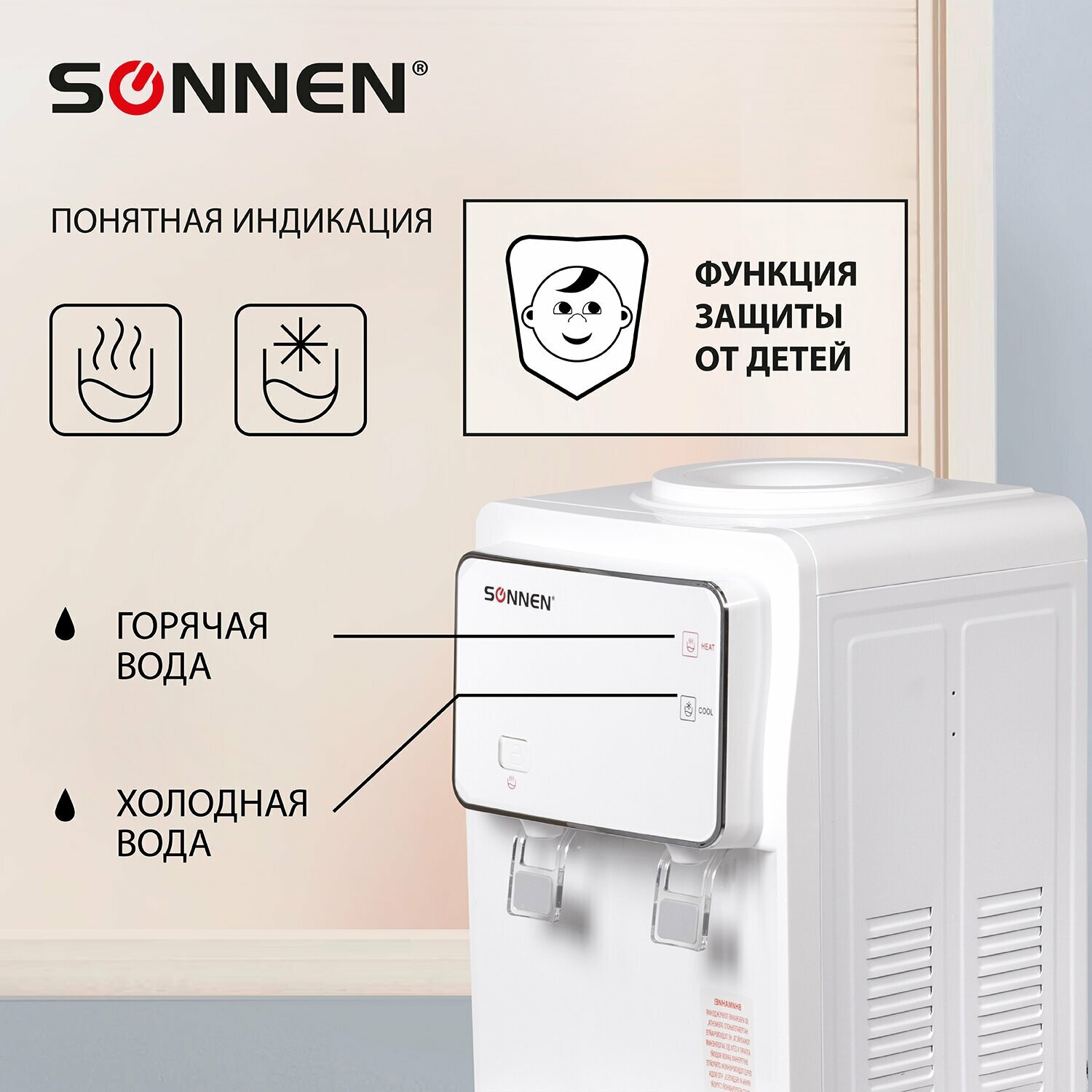 Кулер для воды Sonnen FSE-02M, напольный, электронный нагрев и охлаждение, 2 крана, белый (454999)