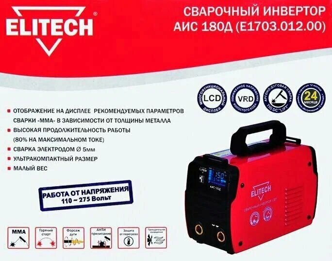 Сварочный инвертор ММА "Elitech" 5.4 кВт, 180А, 355х120х218 Вес,4.6 интересное: