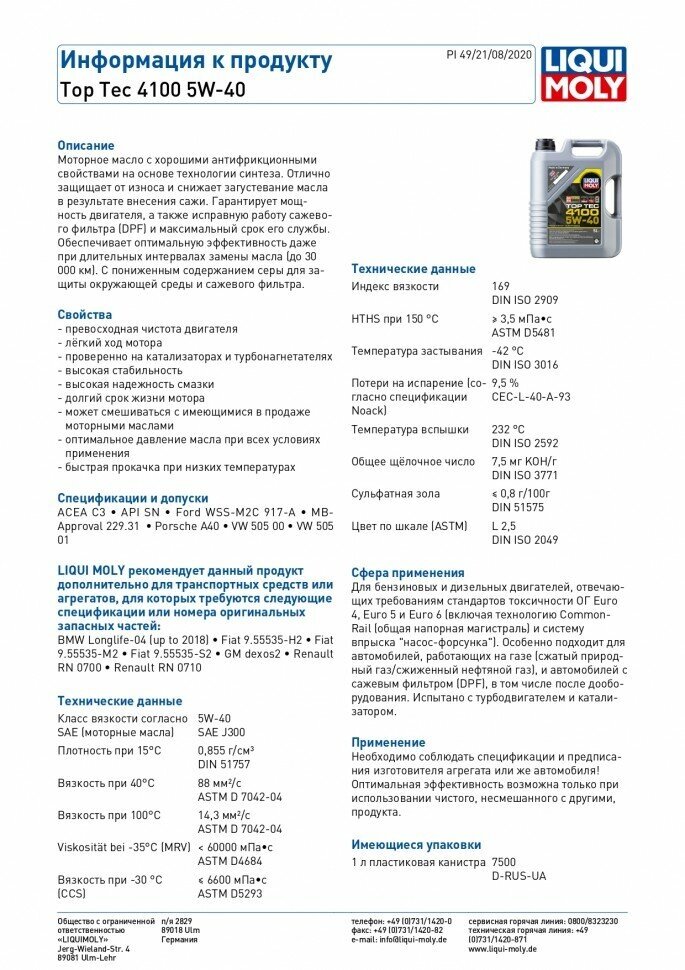 В качестве очередного эксперимента купила Топ Тэк 4100 5W40. Ликви Моли до этого не пробовала, продавец в магазине посоветовал, сказал что хорошее масло и странно, что вы его раньше не брали. Именно этот вариант разрабатывался специально для двигателей автомобилей БМВ и Мерседес, имеет официальные допуски от производителей. По характеристикам подходит идеально и состав достойный. Взяла от безысходности уже и чуда не ждала. Его и не произошло, но стало значительно лучше. Двигатель работает тише и на холостом ходу, и в движении. Машинка радует, стала резвее, динамичнее. Самое главное - жора практически нет, доливаю конечно, без этого уже никуда видимо, но намного меньше. По последним подсчетам ушло около полстакана на 5000 км пробега. Рекомендую это масло для владельцев БМВ. |