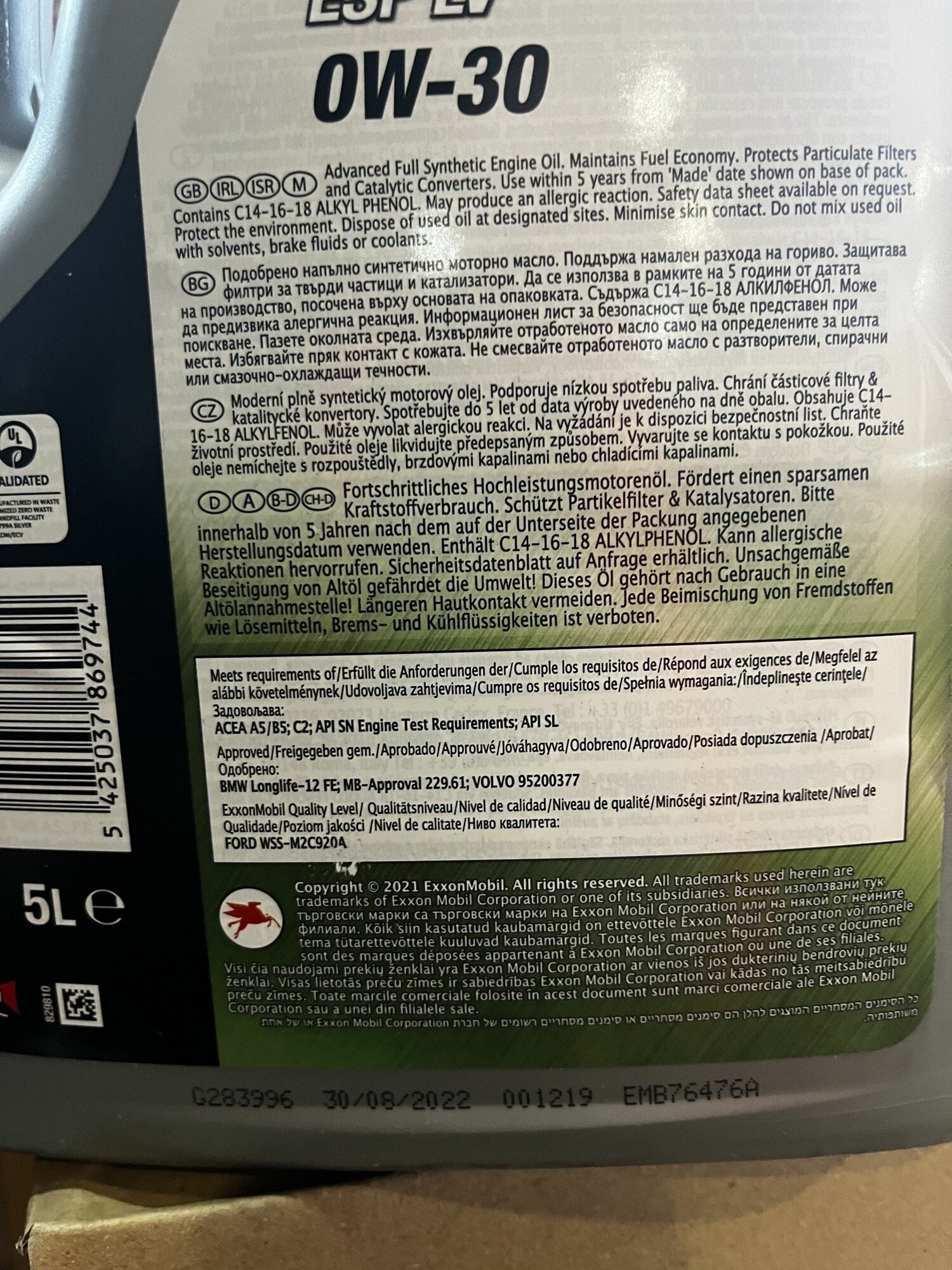 Mobil Mobil 1 Esp Lv Formula 0W30, Sn, A5/B5, C2, Синтетика (4Л.) (1/4)