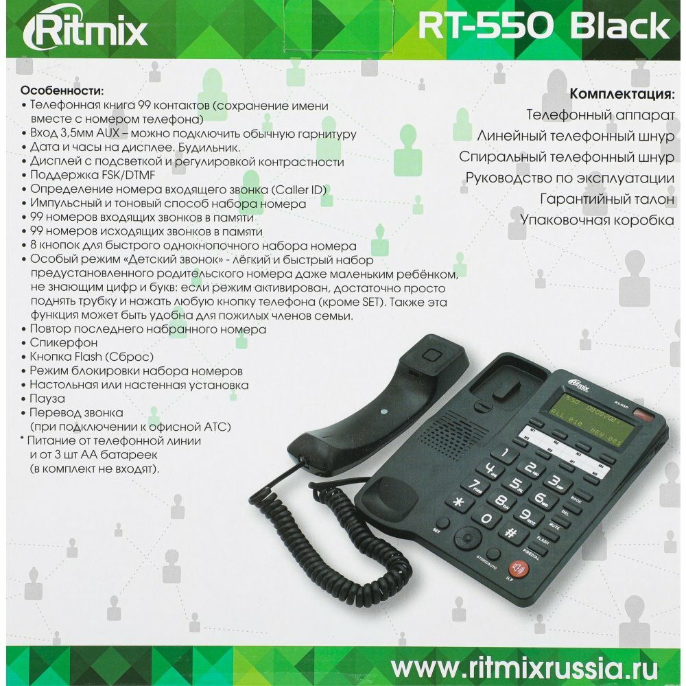 Проводной телефон Ritmix Rt-550, дисплей, телефонная книга, однокнопочный набор, Aux, черный Ritmix .