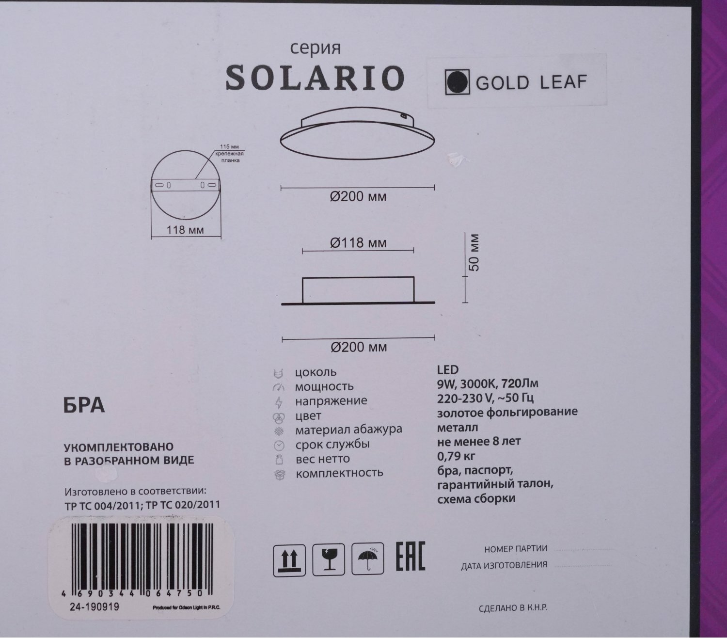 3561/12WL HIGHTECH ODL18 139 золот. фольг-ние Настен. св-ник IP20 LED 3000K 12W 672Лм 220V SOLARIO