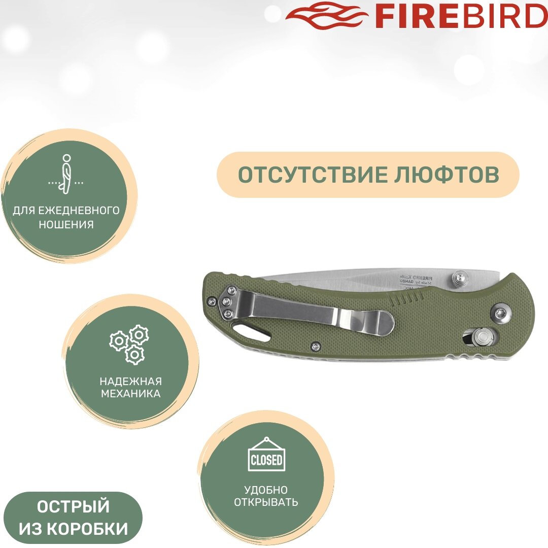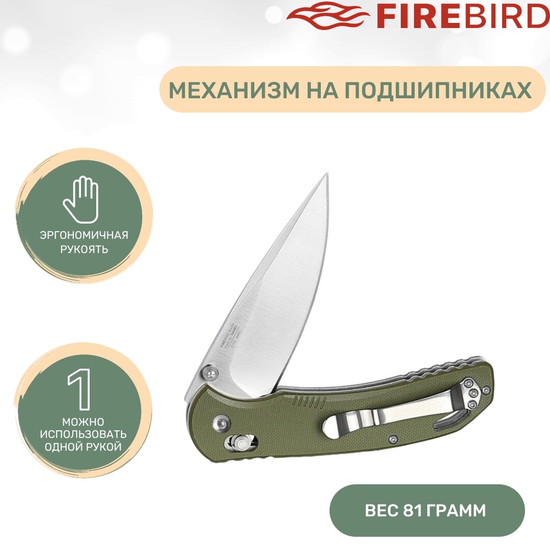 F753M1-GR Нож складной "Firebird by Ganzo" с клипсой, дл.клинка 77 мм, сталь 440С, цв. зелёный.Следопыт