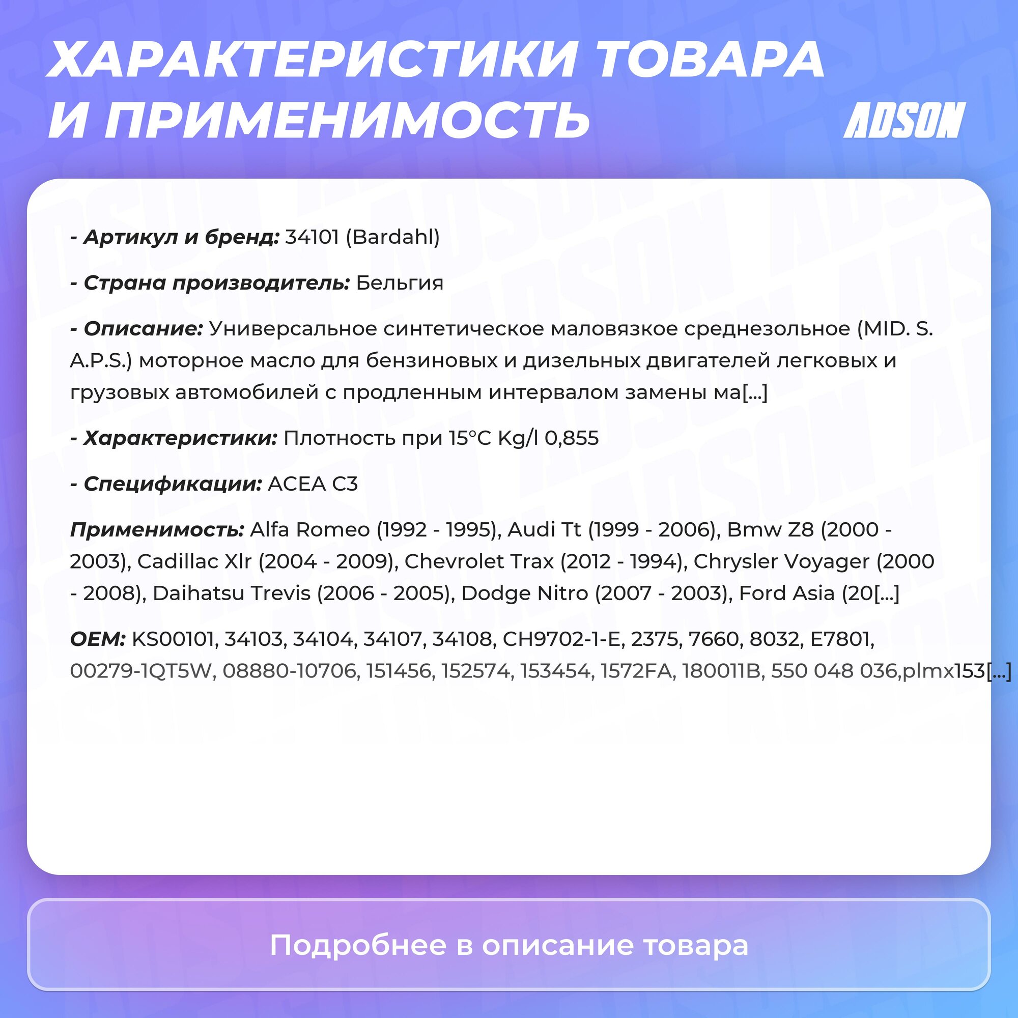 Масло моторное Bardahl XTRA 5w30 синтетическое API SN, ACEA C3, универсальное, 1л, арт. 34101