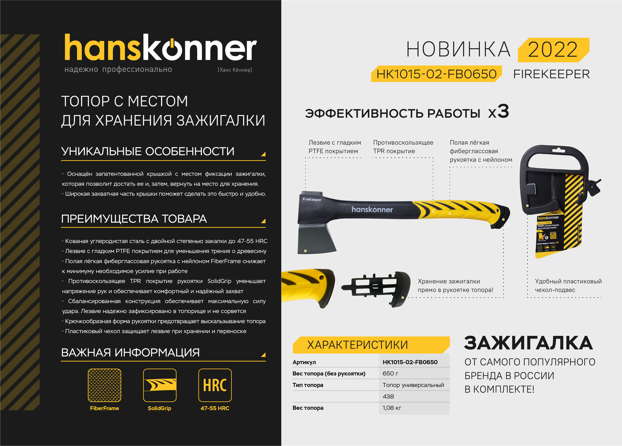 Топор с зажигалкой 650г, фибергл. рукоятка с TPE, PTFE покрытие, Hanskonner