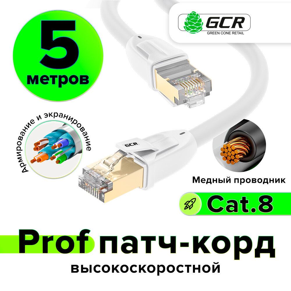 Купить Патч-корд GCR 5м PROF LSZH S/FTP cat.8 40 Гбит/с RJ45 LAN ethernet high speed компьютерный кабель для интернета медный экранированные коннекторы контакты 24K GOLD (GCR-L306) белый