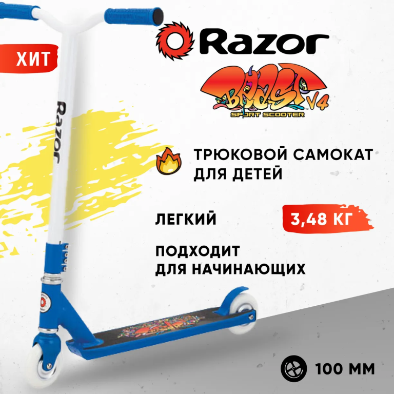 Самокат трюковой детский RAZOR Beast V4 сине-белый - для трюков и прыжков экстремальный для начинающих интересное:
