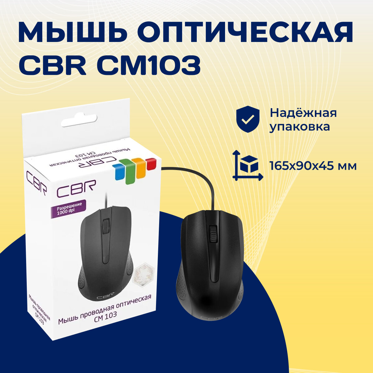 Cbr Мышь CM 103 Black, Мышь проводная, оптическая, USB, 1000 dpi, 3 кнопки и колесо прокрутки, ABS-пластик, длина кабеля 1,5 м, цвет чёрный