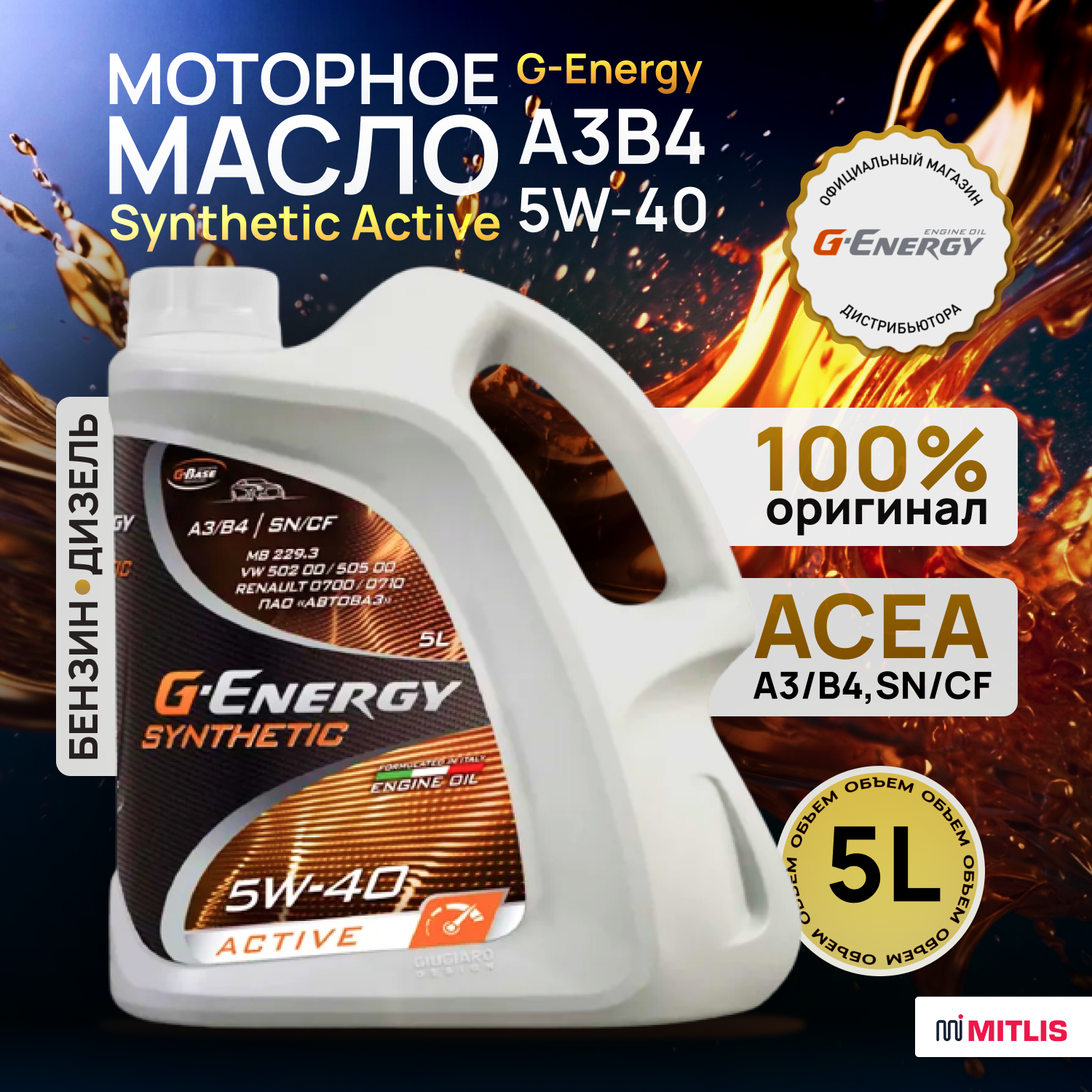 Масло Моторное G-Energy Synthetic Active 5W-40 (1Л.) 253142409 Acea A3/B4; Api Sn/Cf; Mb 229.3; Vw 502 00/505 00; Renault Rn ...