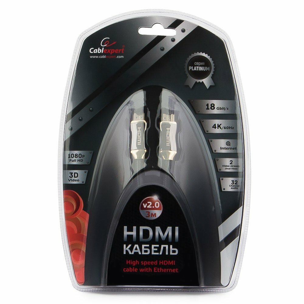 Кабель HDMI Cablexpert, серия Platinum, 3 м, v2.0, M/M, позол.разъемы, металлический корпус, нейлоно