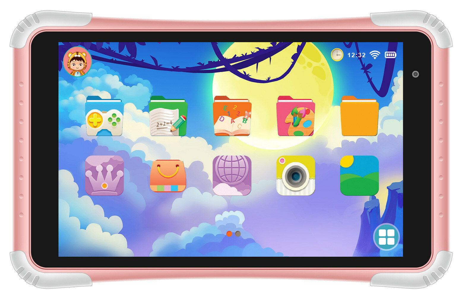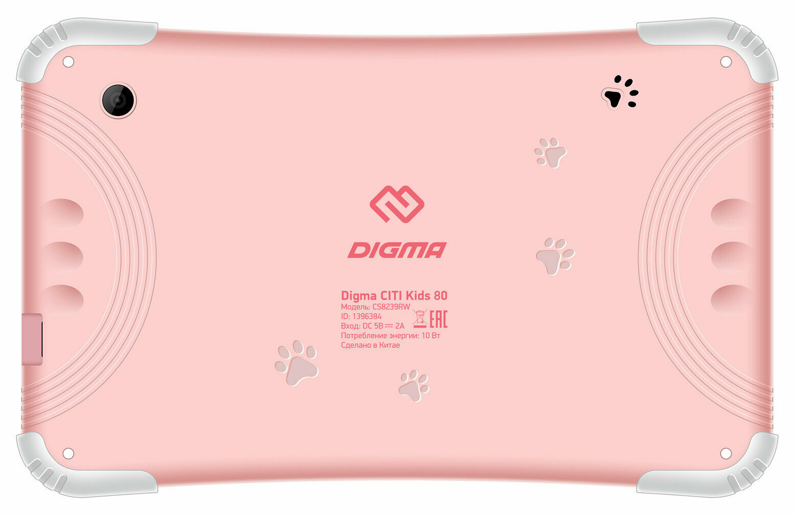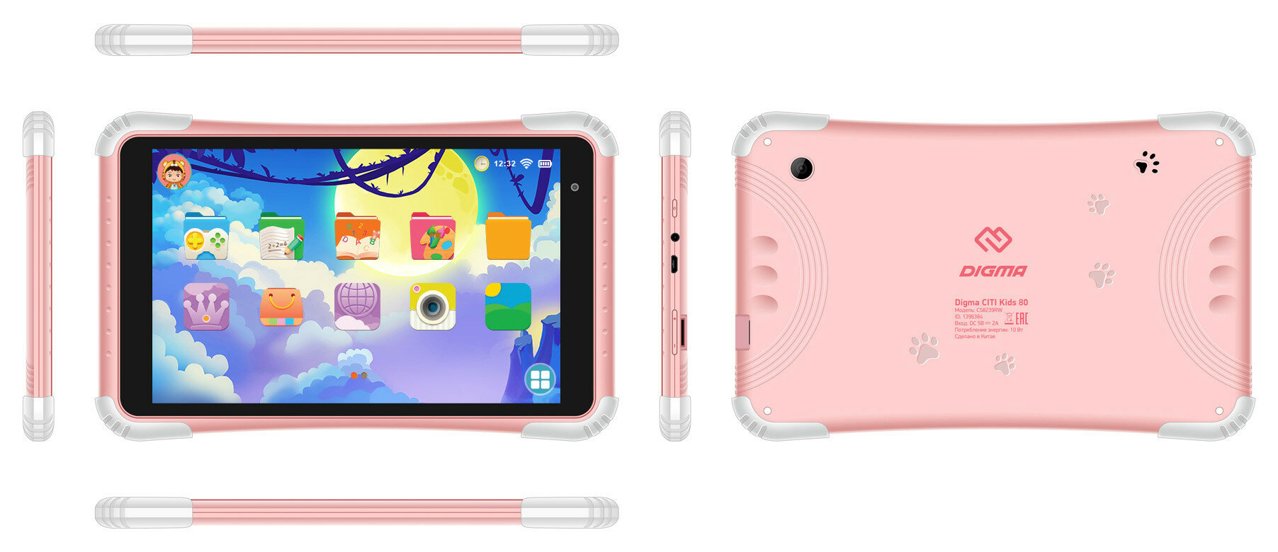 | Плюсы: | Диагональ экрана 8 дюймов, яркий розовый цвет корпуса, прорезиненные углы, контрастное изображение, детский контент. |