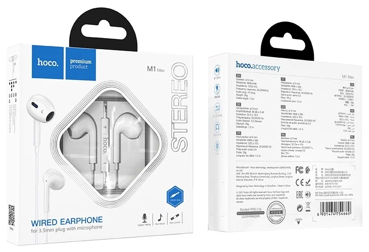 Наушники внутриканальные HOCO M1, Max, Jack 3.5мм, 1.2 м, цвет: белый