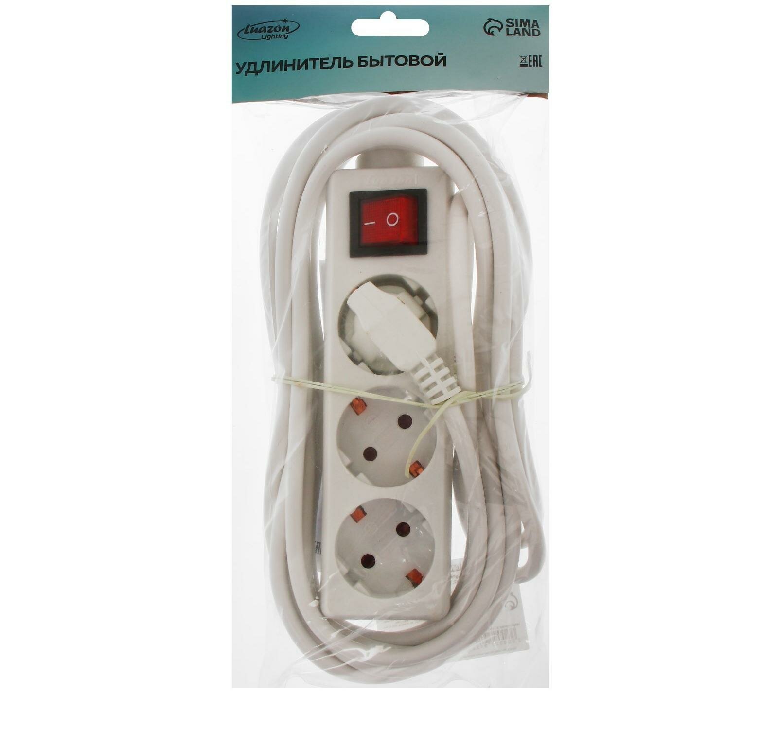 Удлинитель Luazon Lighting, 3 розетки, 5 м, 6А, 1300 Вт, ПВС 3х0.75 мм2, с з/к, с выкл., Б Luazon Li интересное: