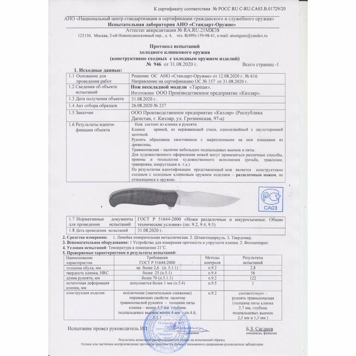 | Конструкция ножа | фиксированный |