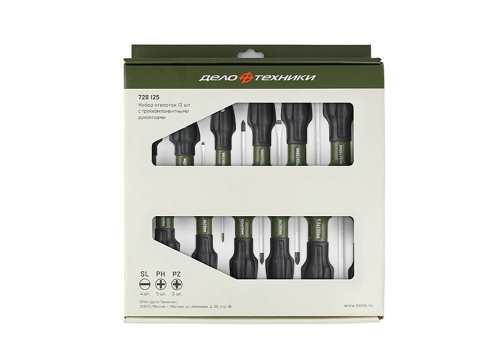 Набор отвёрток c трехкомпонентными рукоятками SL, PH, PZ, 12штук, Дело Техники, 728125