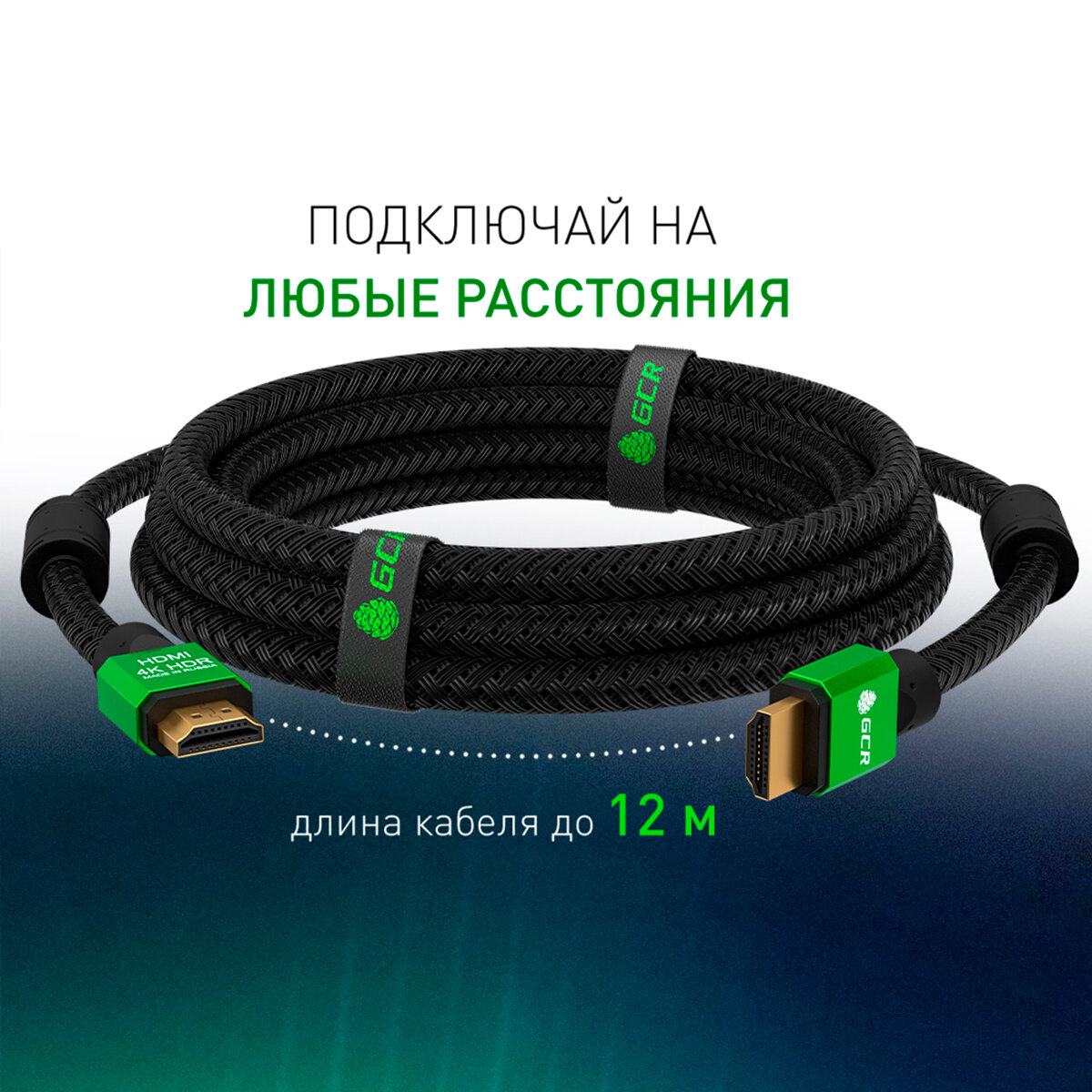 HDMI провод 12м GCR Ultra HD 4K 3D 18 Гбит/с для DVD частично нейлон черный с ферритовыми кольцами 24K GOLD