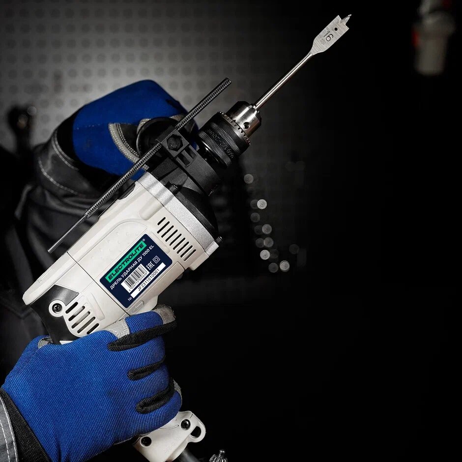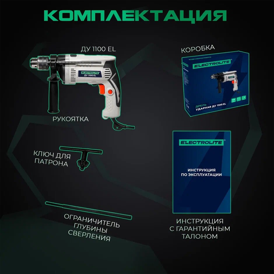 Дрель ударная электрическая ELECTROLITE ДУ 1100 EL (1100 Вт, регулировка оборотов, 52000 уд/мин) для сверления металла бетона и дерева
