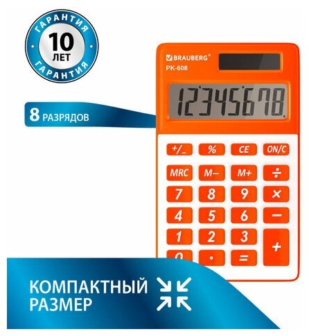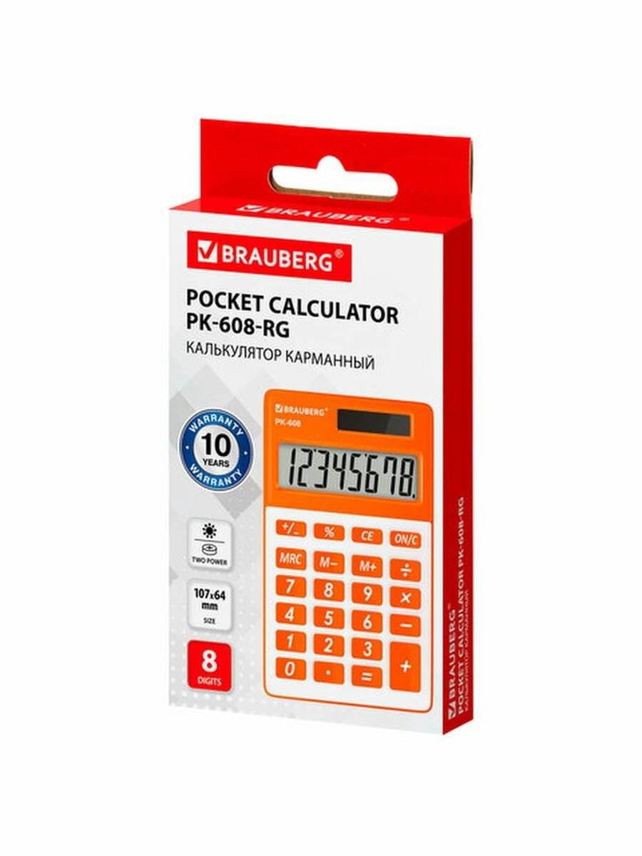 Калькулятор карманный BRAUBERG PK-608-RG (107x64 мм), 8 разрядов, двойное питание, оранжевый, 250522 В комплекте: 1шт.