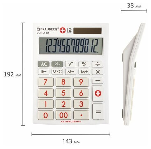 Калькулятор настольный BRAUBERG ULTRA-12-WAB (192x143 мм), 12 разрядов, двойное питание, антибактериальное покрытие, белый, 250506, 250506