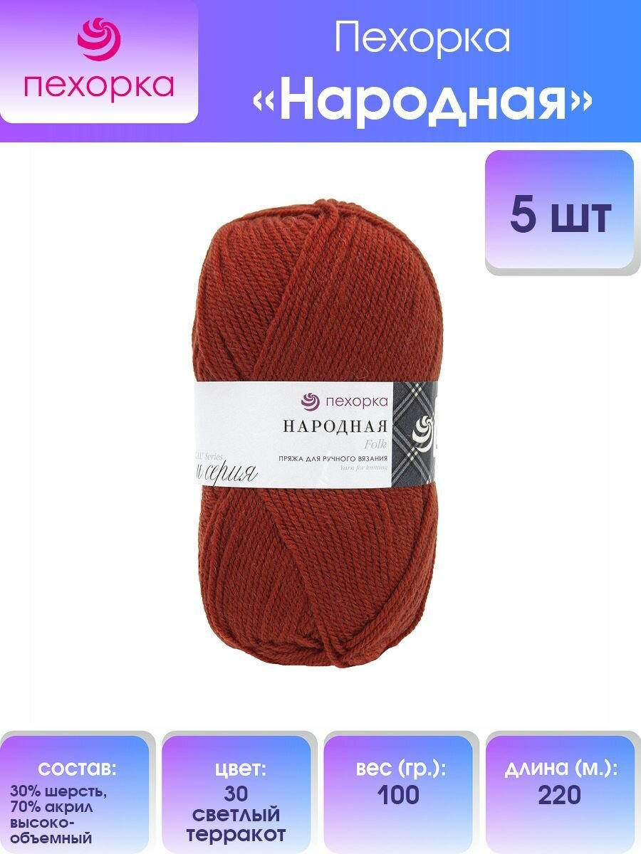 Пряжа Пехорская ПТ Народная Шерсть-30%, Акрил-70% 5 шт. х 100 г 220 м +- 13 м N030 св.теракот