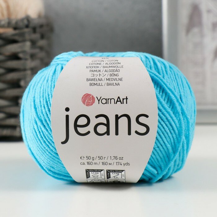 Пряжа YarnArt Jeans, цвет бирюзово-голубой 33, 1 моток, 50г/160м, состав 45% акрил, 55% хлопок, ярнарт джинс
