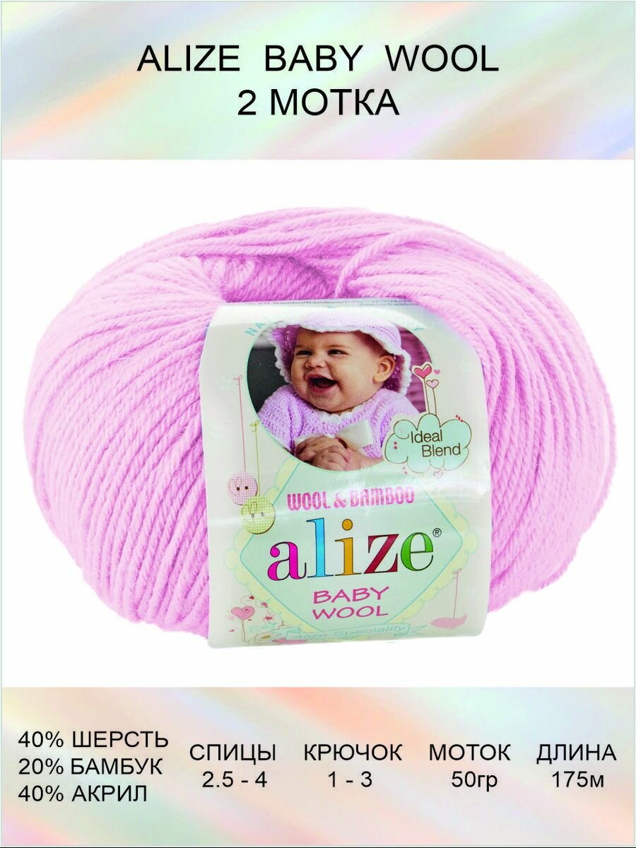 Пряжа для вязания ALIZE BABY WOOL Ализе Бэйби Вул Детская: 185 (светло-розовый) / 2 шт / 175 м / 50 г / 40% шерсть, 20% бамбук, 40% акрил