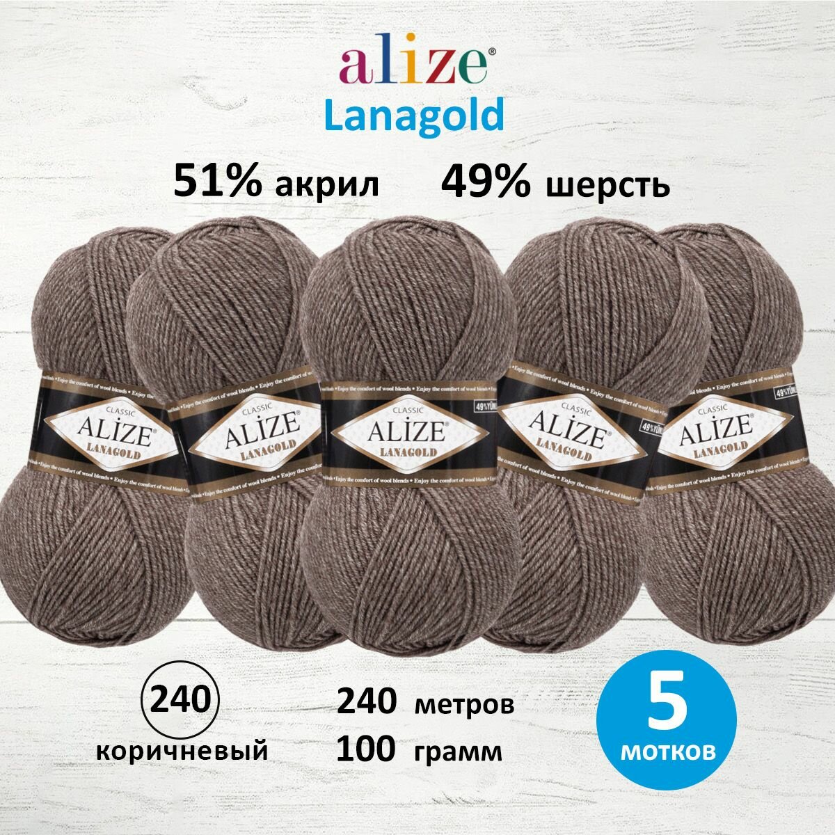 Купить Пряжа Alize Lanagold светло-коричневый/меланж (240), 51%акрил/49%шерсть, 240м, 100г, 5шт