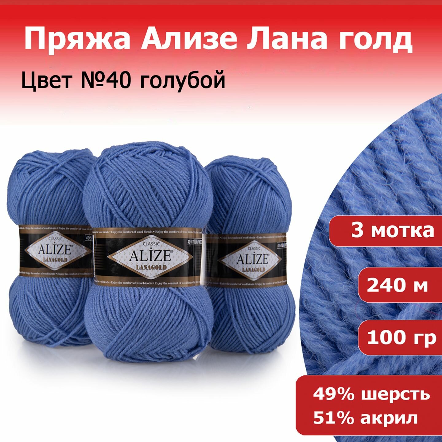 Купить Пряжа Alize Lanagold голубой (40), 51%акрил/49%шерсть, 240м, 100г, 3шт