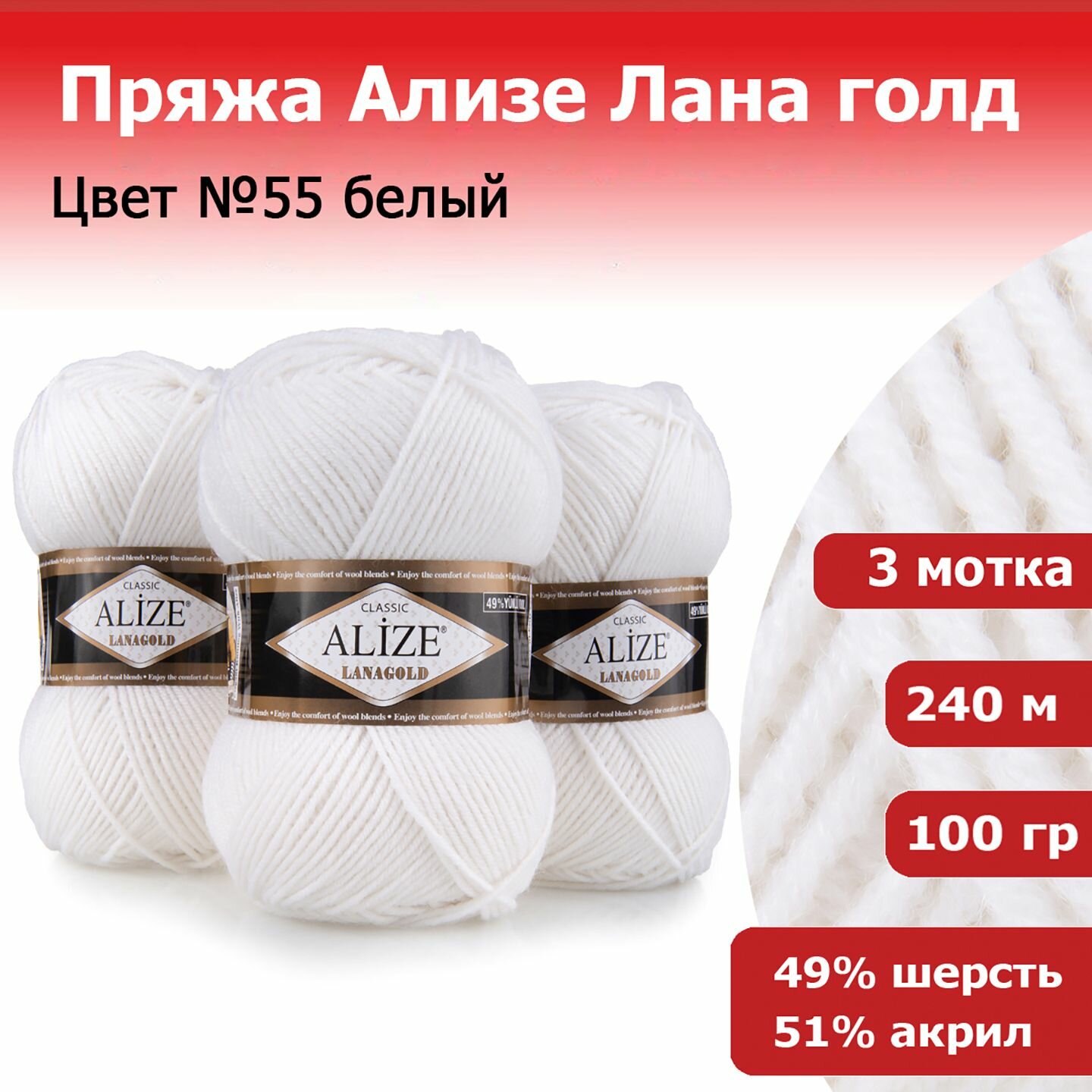 Купить Пряжа Alize Lanagold белый (55), 51%акрил/49%шерсть, 240м, 100г, 3шт