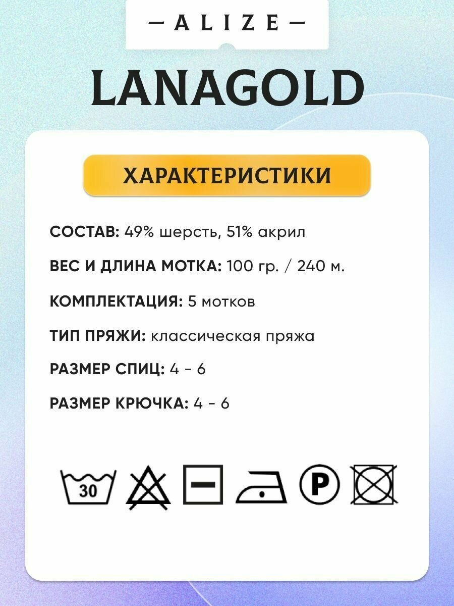Пряжа Alize Lanagold | Турция | 5шт упаковка | Акрил: 51%, Шерсть: 49%