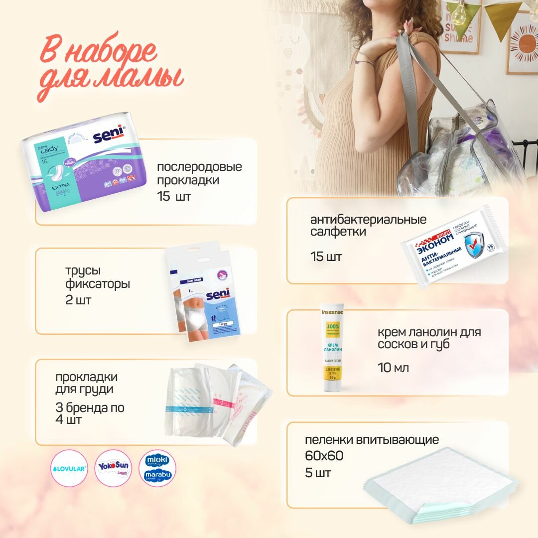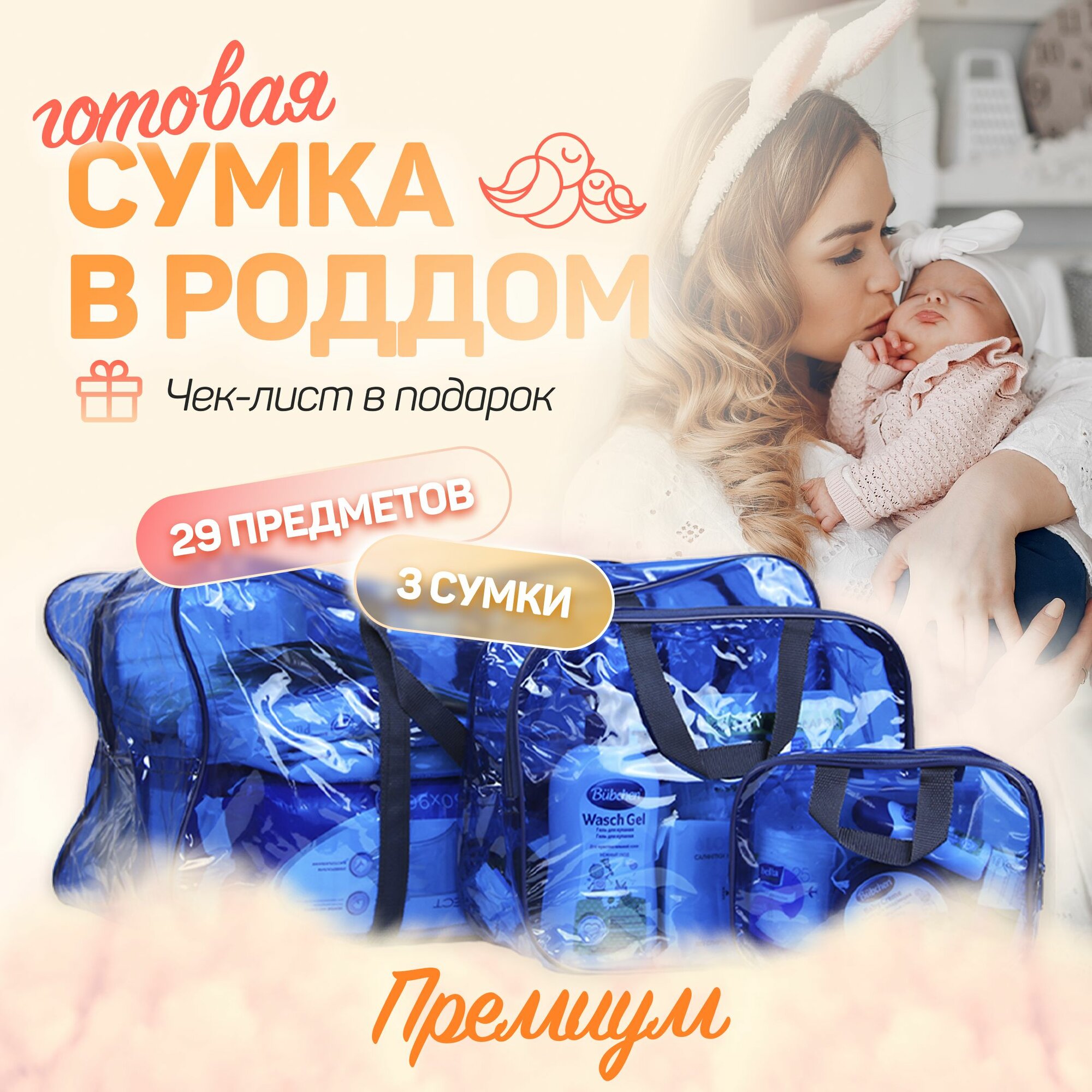 Сумка в роддом для мамы и малыша готовая с наполнением, 29 предметов + 3 сумки, комплектация "Премиум", прозрачная