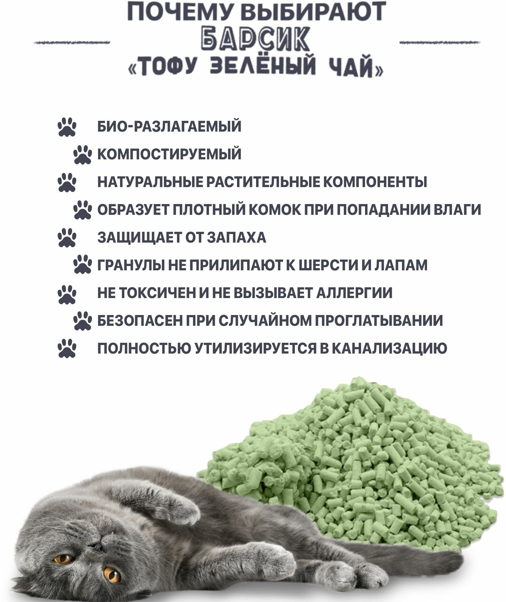 Натуральный соевый тофу наполнитель для кошачьих туалетов комкующийся Барсик TOFU Зеленый чай 30 л