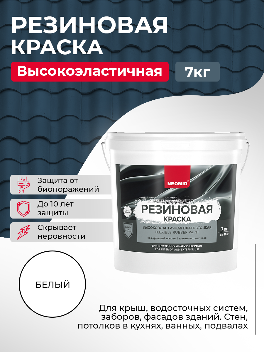 Краска Резиновая Neomid 7кг Белый для Кровли, Цоколя, Фасада Суперэластичная, Универсальная / Неомид Резиновая.