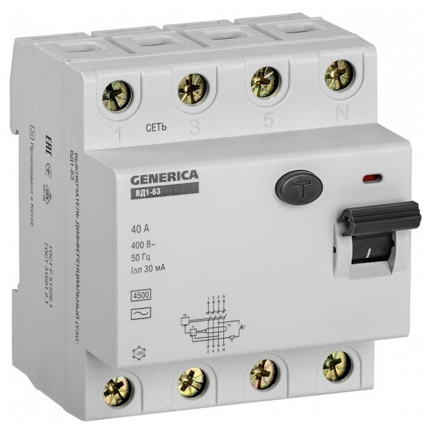 Устройство защитного отключения 4П 40А 30мА GENERICA ВД1-63