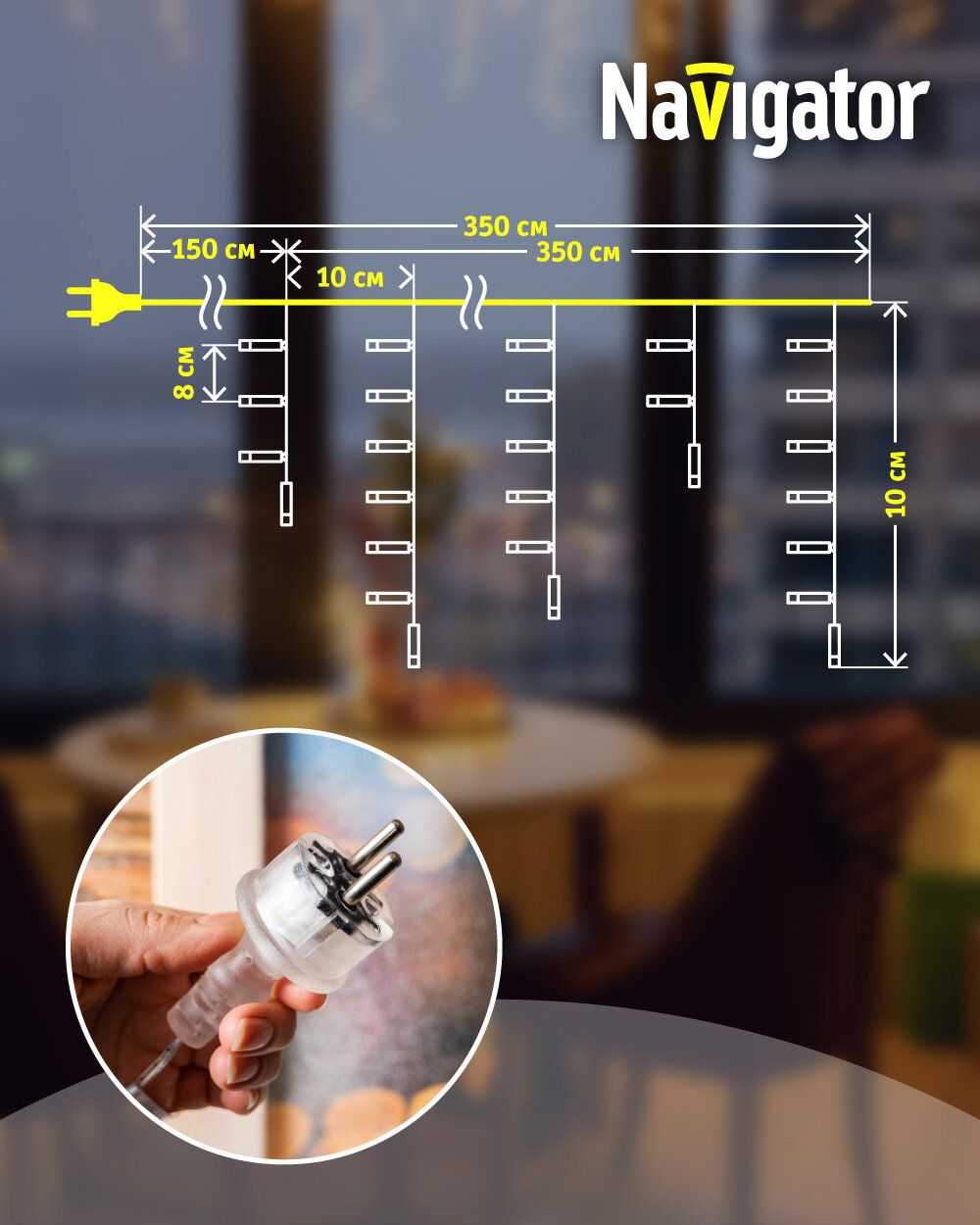 Гирлянда Navigator бахрома NGF-I02-100, 3.5 х 0.5 х 0.2 м, 0.2 х 0.5 м, 100 ламп, теплый белый/прозрачный провод