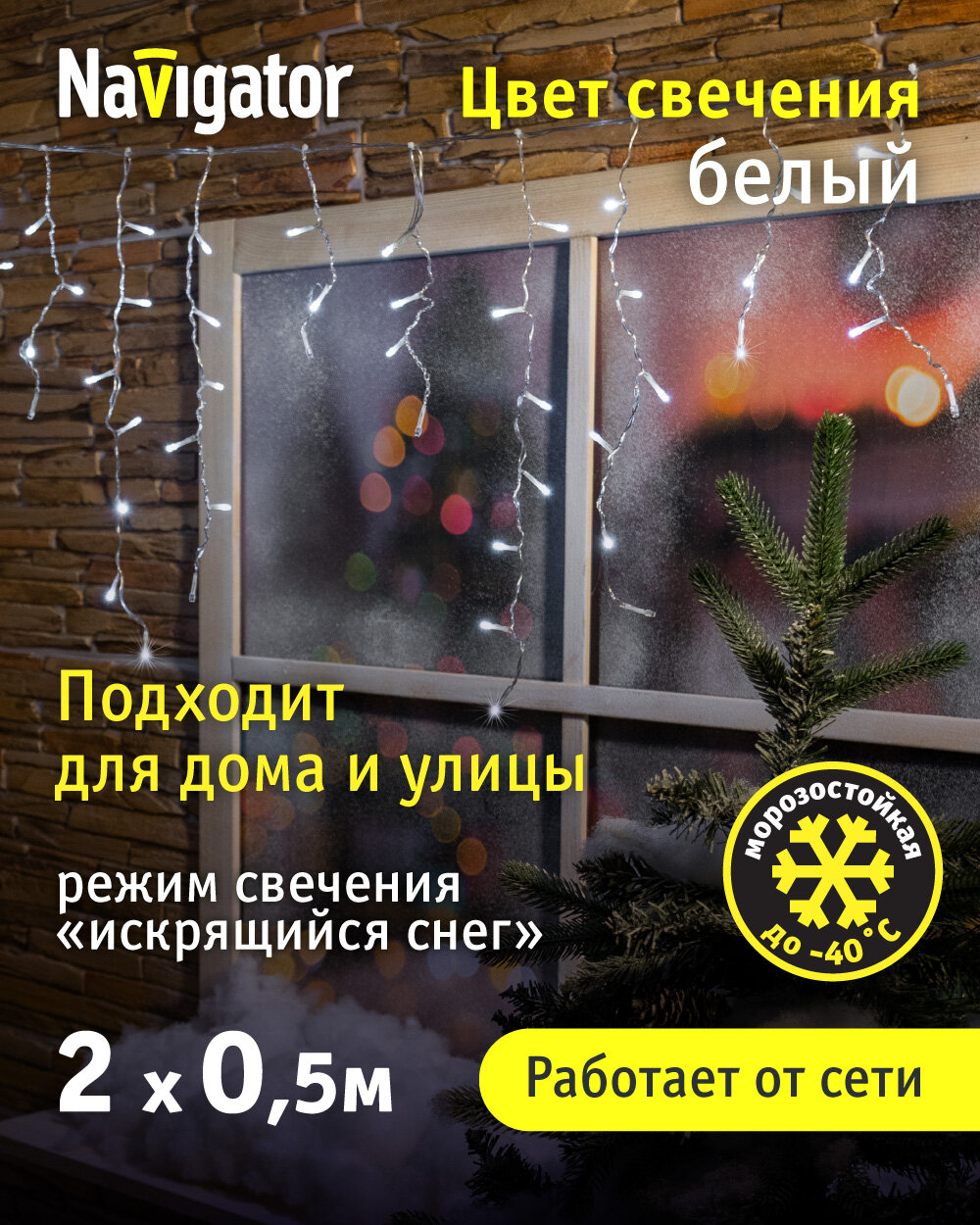 Купить Гирлянда «Бахрома» Navigator 61 844, искрящийся снег, белый, 2*0.5 м, IP44