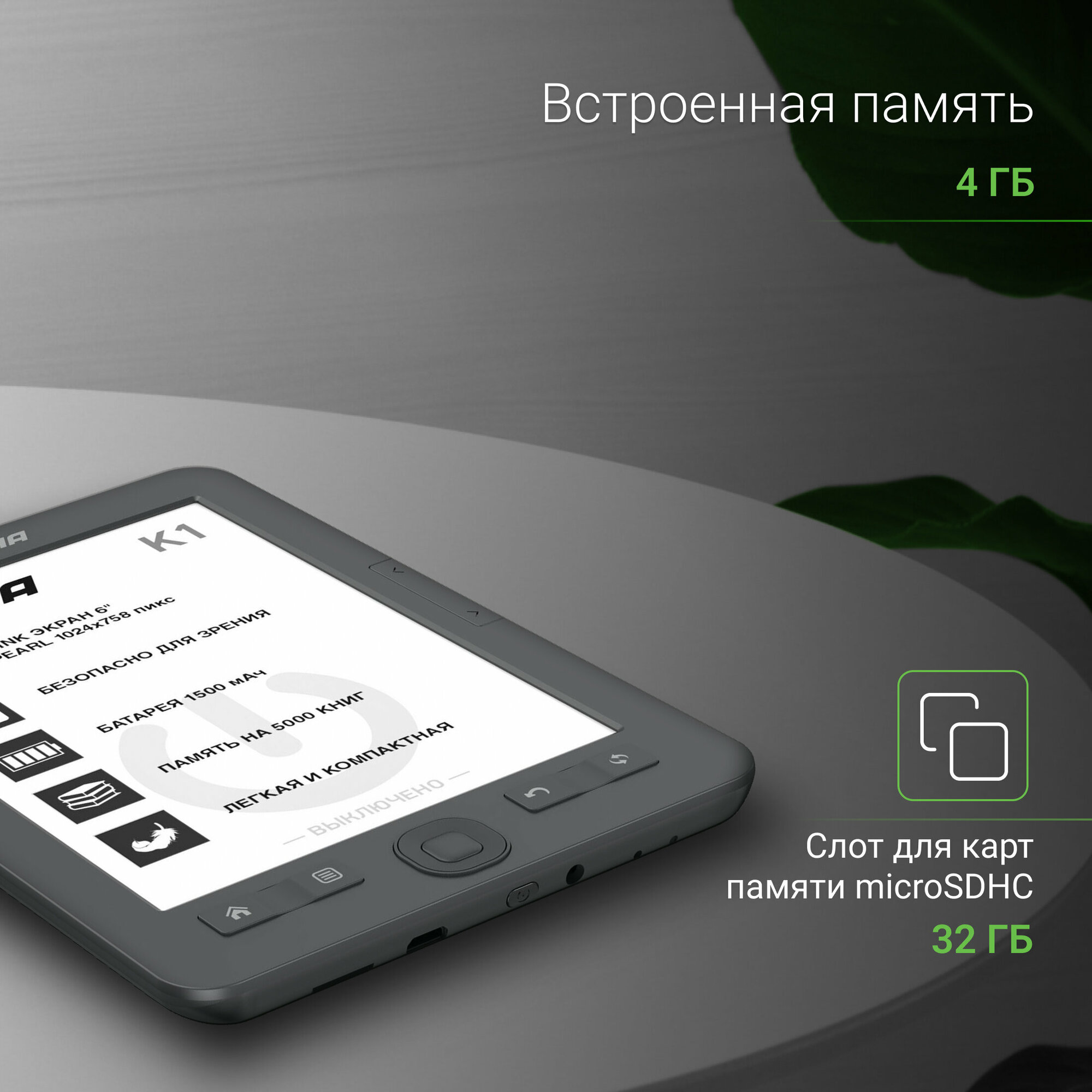| Плюсы: | Использование одной рукой, матовый черный цвет, автономный аккумулятор, качественно упакован, на встроенную память можно закачать пару тысяч книг. |