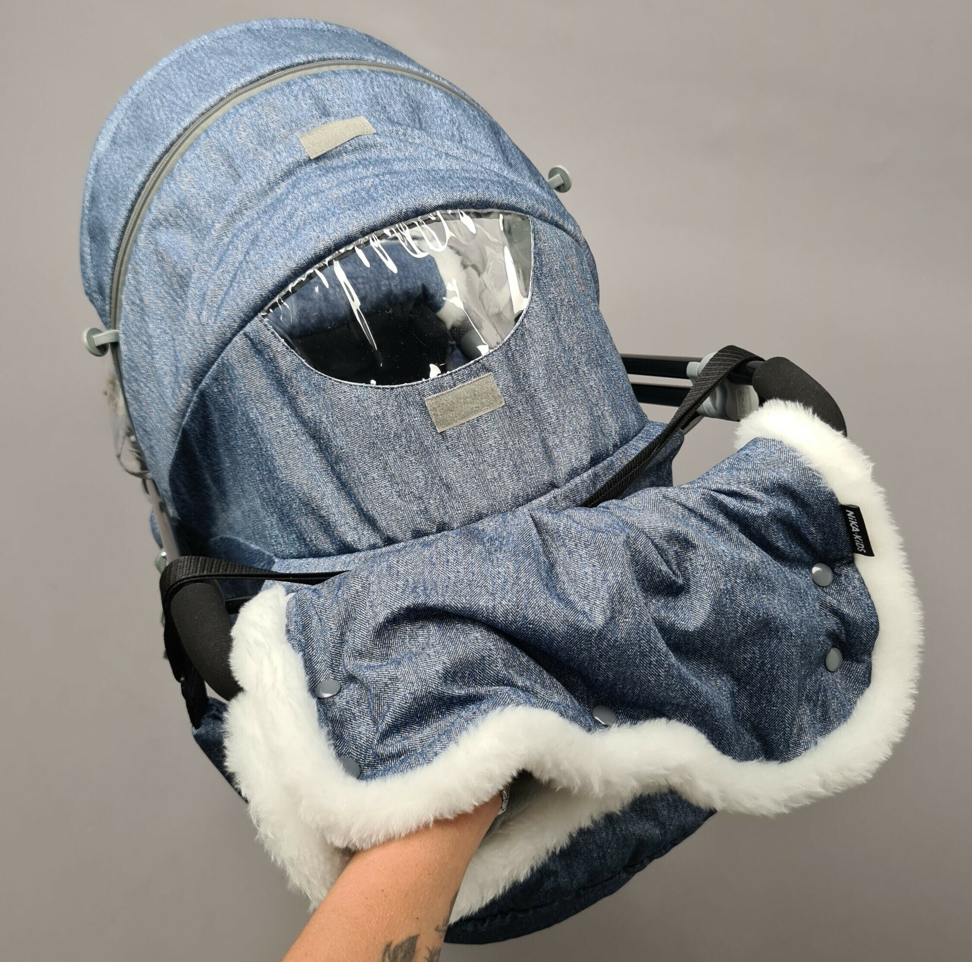 Санки-коляска Nika Наши детки 6 НДТ6, джинс зеленый, перекидная ручка, муфта, барьерка, сумочка
