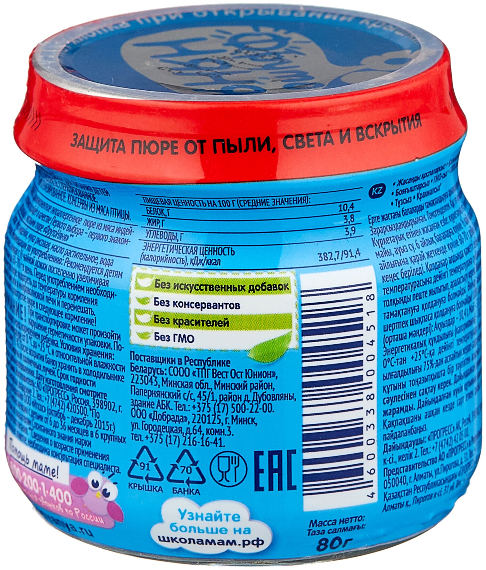 | Плюсы: | Хороший вкус и консистенция, отсутствие добавок (в аналогичном пюре других марок они есть) |