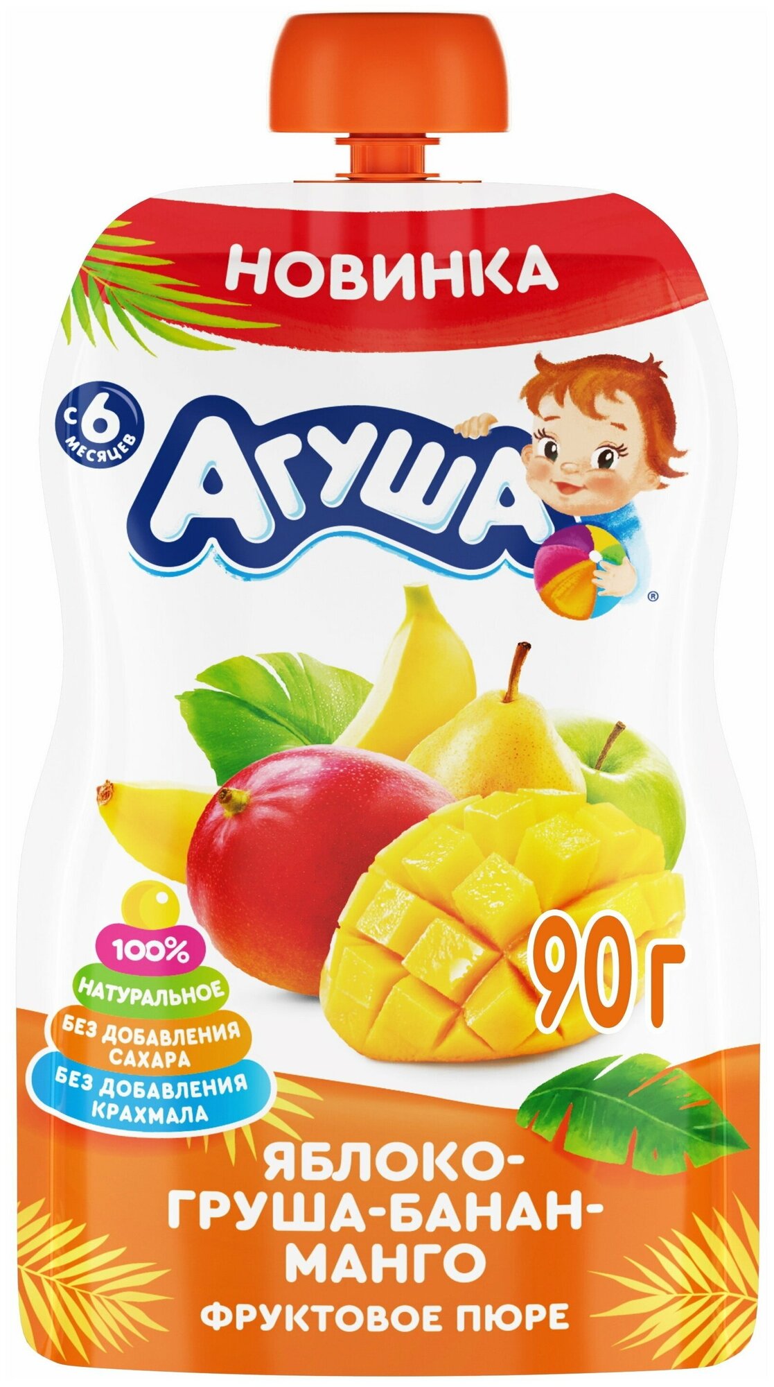 Пюре фруктовое агуша Яблоко, груша, банан и манго, с 6 месяцев, 90г